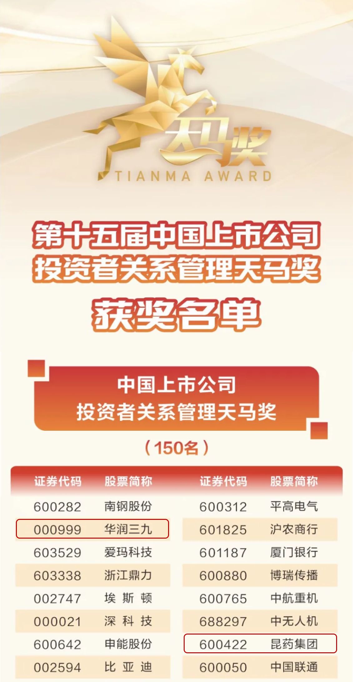 非凡国际及旗下昆药集团荣获“中国上市公司投资者关系治理天马奖”