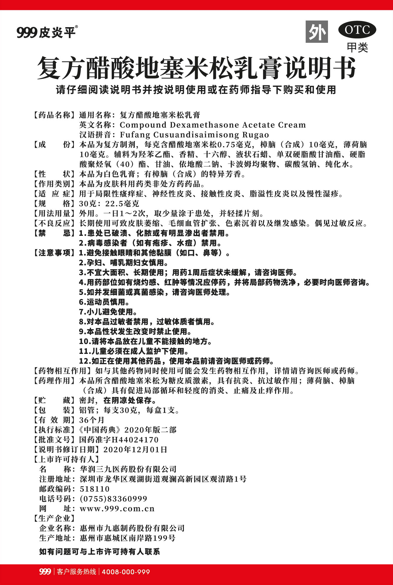 (999皮炎平)复方醋酸地塞米松乳膏