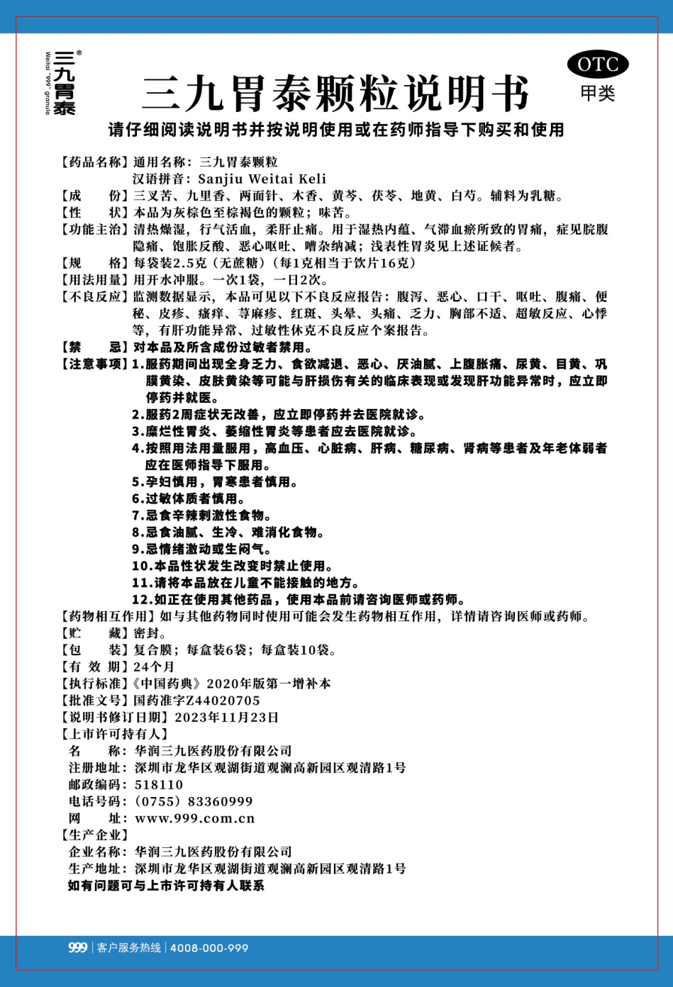 三九胃泰颗粒(2.5g无蔗糖)说明书[观澜2401版]
